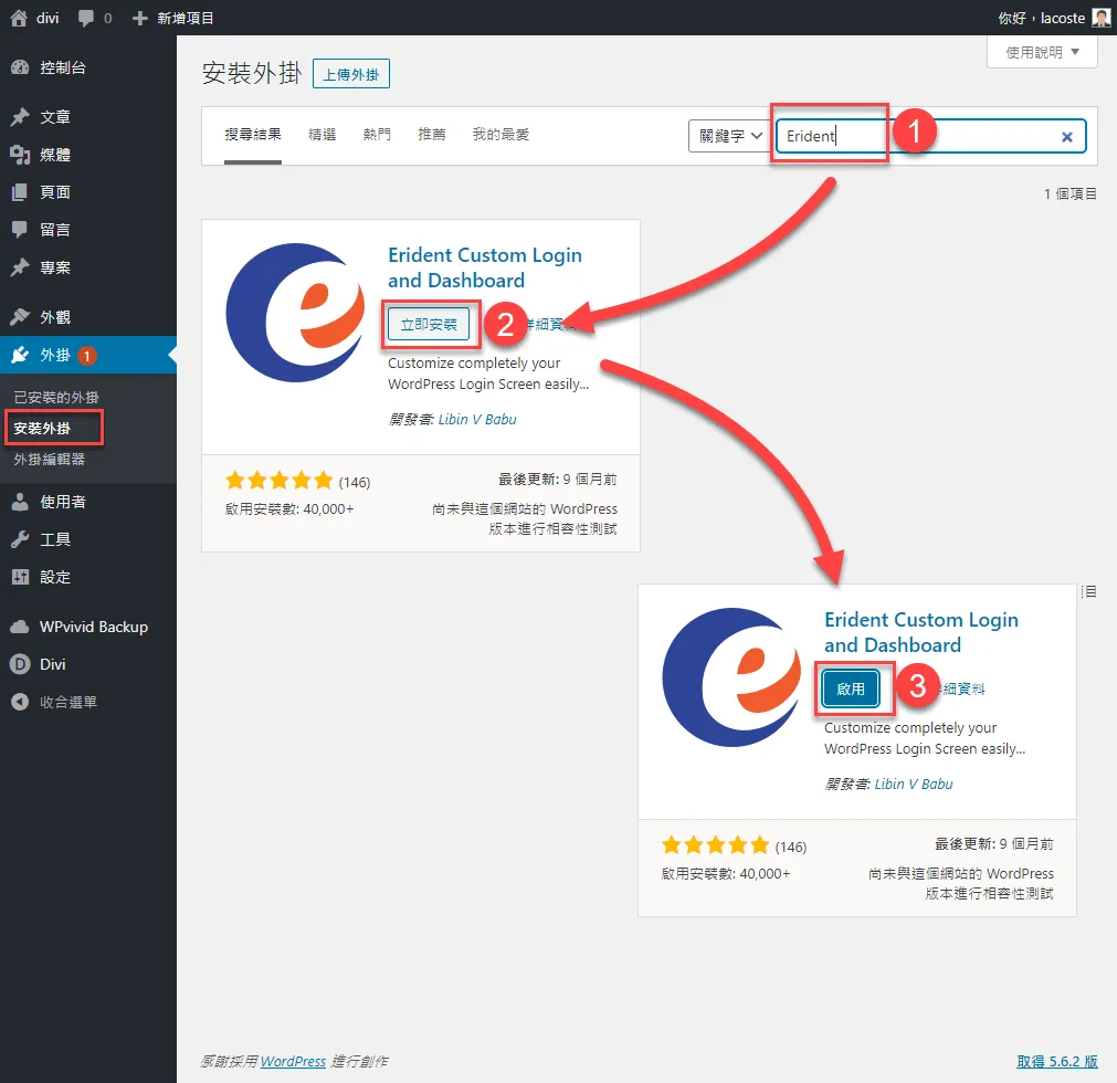 搜尋Erident這個字,可以直接找到外掛,然後按立即安裝,安裝完後啟用。我們將用它來製作後台登入頁面。