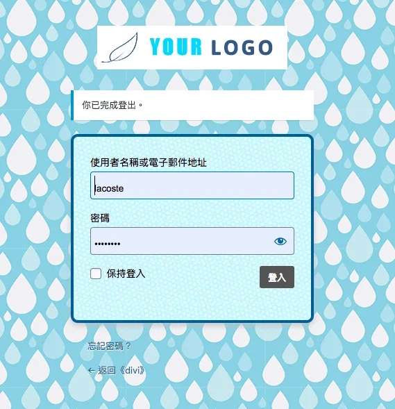 此時我們先登出,可以看到目前的登入畫面已經被修改成這個樣子。看起來有點醜…不過沒關係,這代表我們接下來可以改的地方有很多。