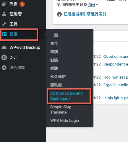 我們再登入回到後台,在後台設定→Custom Login and Dashboard,在這裡就可以進行登入頁面的設定。進入後有5個主要的設定: