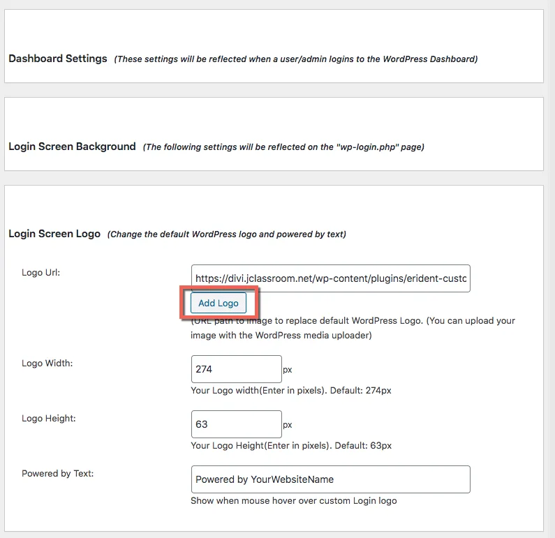 在Login Screen Logo→Logo Url按Add Logo鈕,會連結到媒體庫,請將logo圖檔上傳。