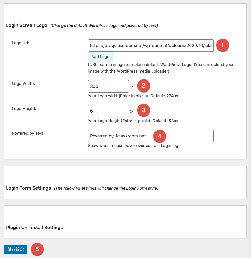 捲動到下方Login Form Setting區塊,這裡有一些關於後台登入表單的外觀設定,您可以自己視需要來設定。以下是我的設定供大家參考: