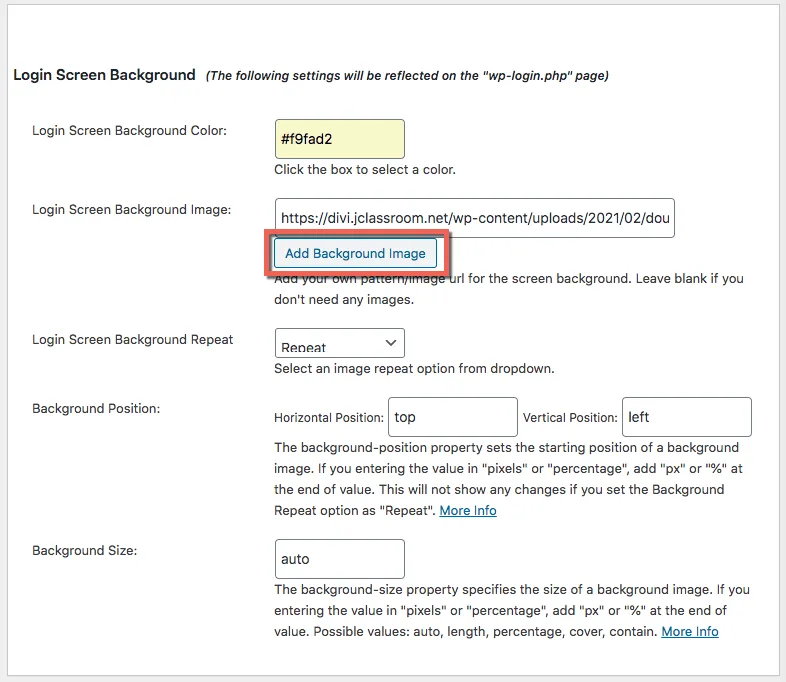 回到後台,點選上方Login Screen Background這個區塊,按Add Background Image這個鈕,將剛剛的背景圖檔上傳。其他的設定都維持預設即可,背景圖會自動拼接起來。
