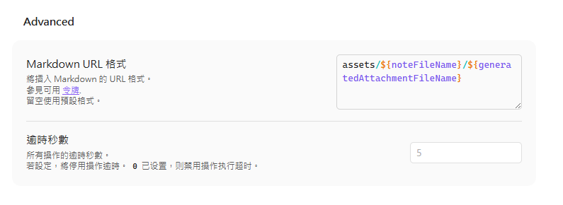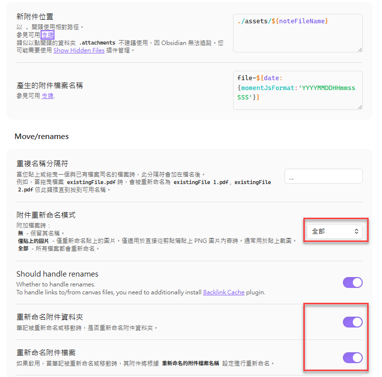 另一個設定是「重新命名」附件檔案名稱,要依下圖設定。這樣所有剪下、貼上的圖片,就會自動命名,並保存在 assets 子資料夾。