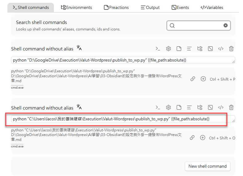 在 Obsidian 安裝 Shell commands 的外掛,這個外掛可以讓我們用快速鍵直接執行指令。這個指令就等同於 Python 的發布指令。我把這個 Python程式,放在Github上,大家可以下載運用。